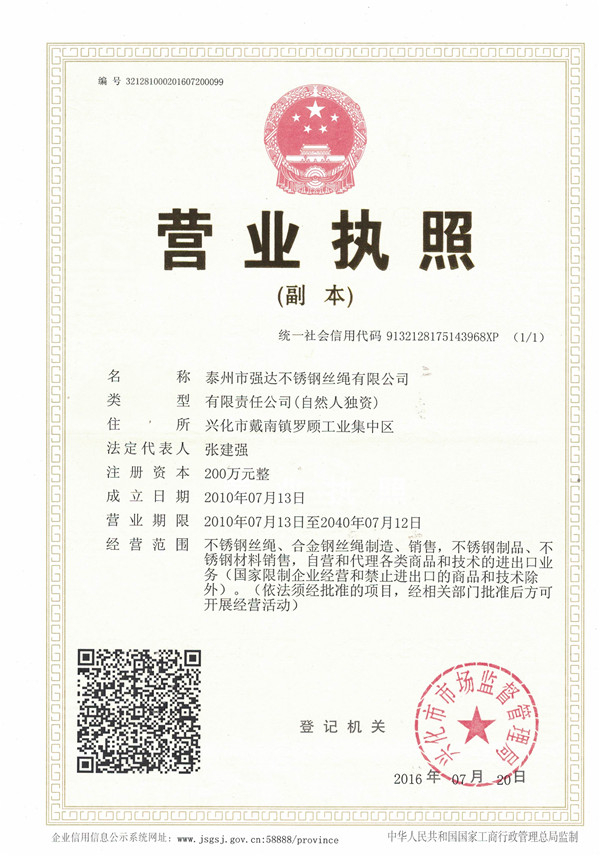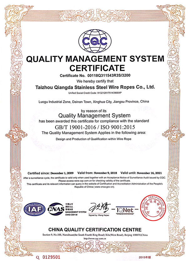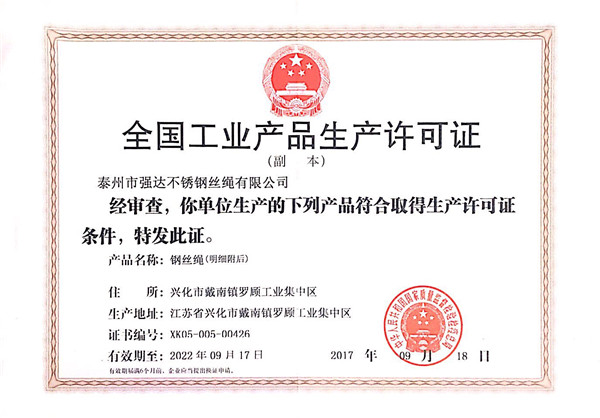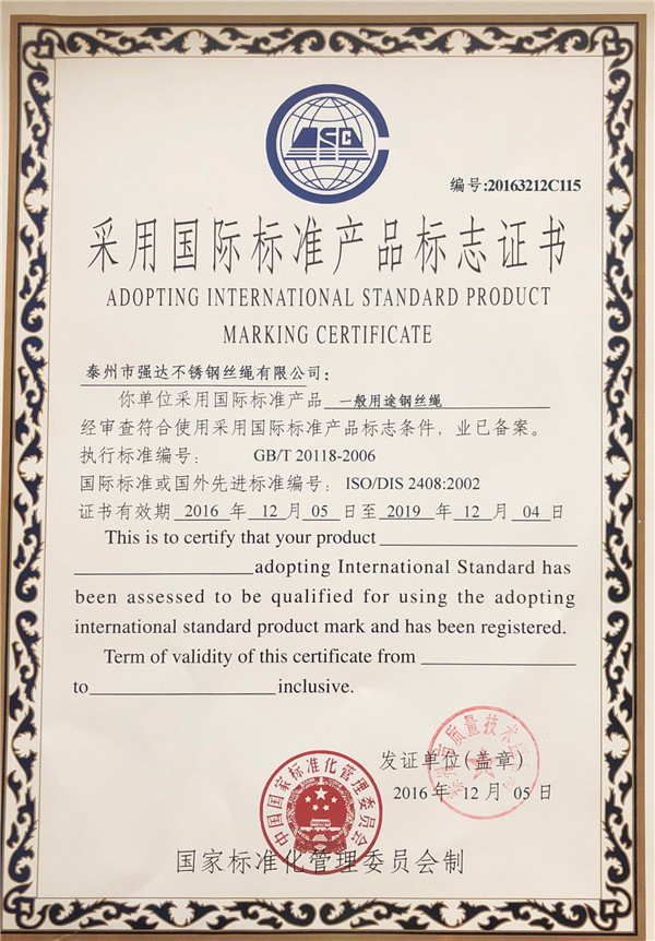 泰州市強(qiáng)達(dá)不銹鋼絲繩有限公司位于江蘇興化市戴南經(jīng)濟(jì)開發(fā)區(qū),公司致力于不銹鋼絲繩產(chǎn)品生產(chǎn),立志成為“國(guó)內(nèi)技術(shù)標(biāo)桿型吊索具生產(chǎn)企業(yè)”。以此戰(zhàn)略思想指導(dǎo),公司堅(jiān)決貫徹“質(zhì)量贏市場(chǎng),管理增效益,誠(chéng)信贏天下”的質(zhì)量方針。以完善的服務(wù)在國(guó)內(nèi)不銹鋼絲繩市場(chǎng)樹立良好的品牌形象。公司榮獲“江蘇省質(zhì)量信得過企業(yè)。 靈活的管理機(jī)制,經(jīng)驗(yàn)豐富的